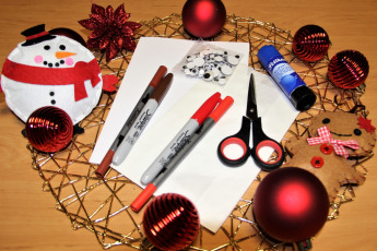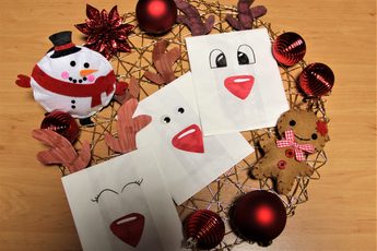 Ihr benötigt: weißes Papier, Stifte in Rot und Braun, Kleber, Schere, Butterbrotpapiertüten und Wackelaugen (optional)